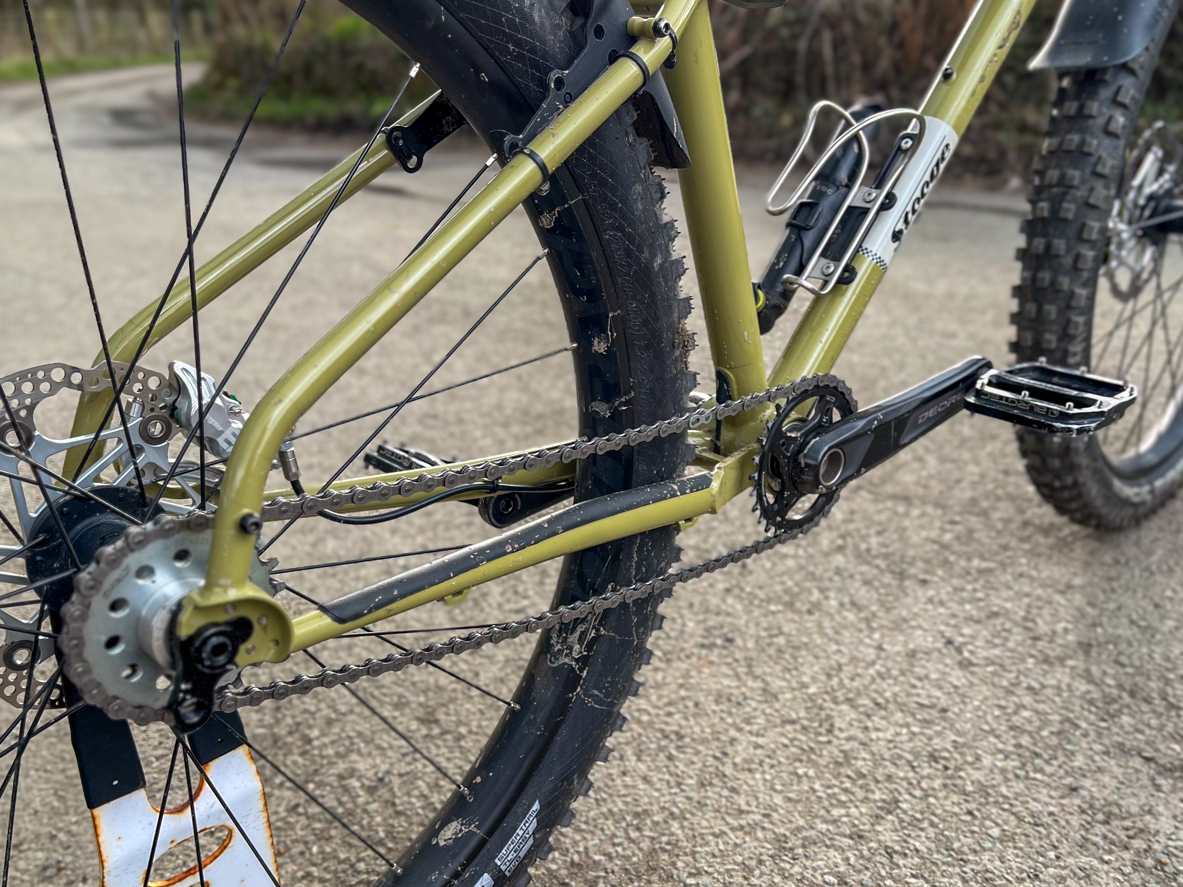 Knees be damned, it’s still single speed. I honestly don’t think I would want to build this bike up with gears, as its simplicity is a big part of its charm. The 22T Surly cog, 9-speed SRAM chain and 28T OneUp Switch chainring persist, but the cranks are now Shimano Deore. The only reason for this is that the original SLXs feel more at home on my Enigma, aesthetically.