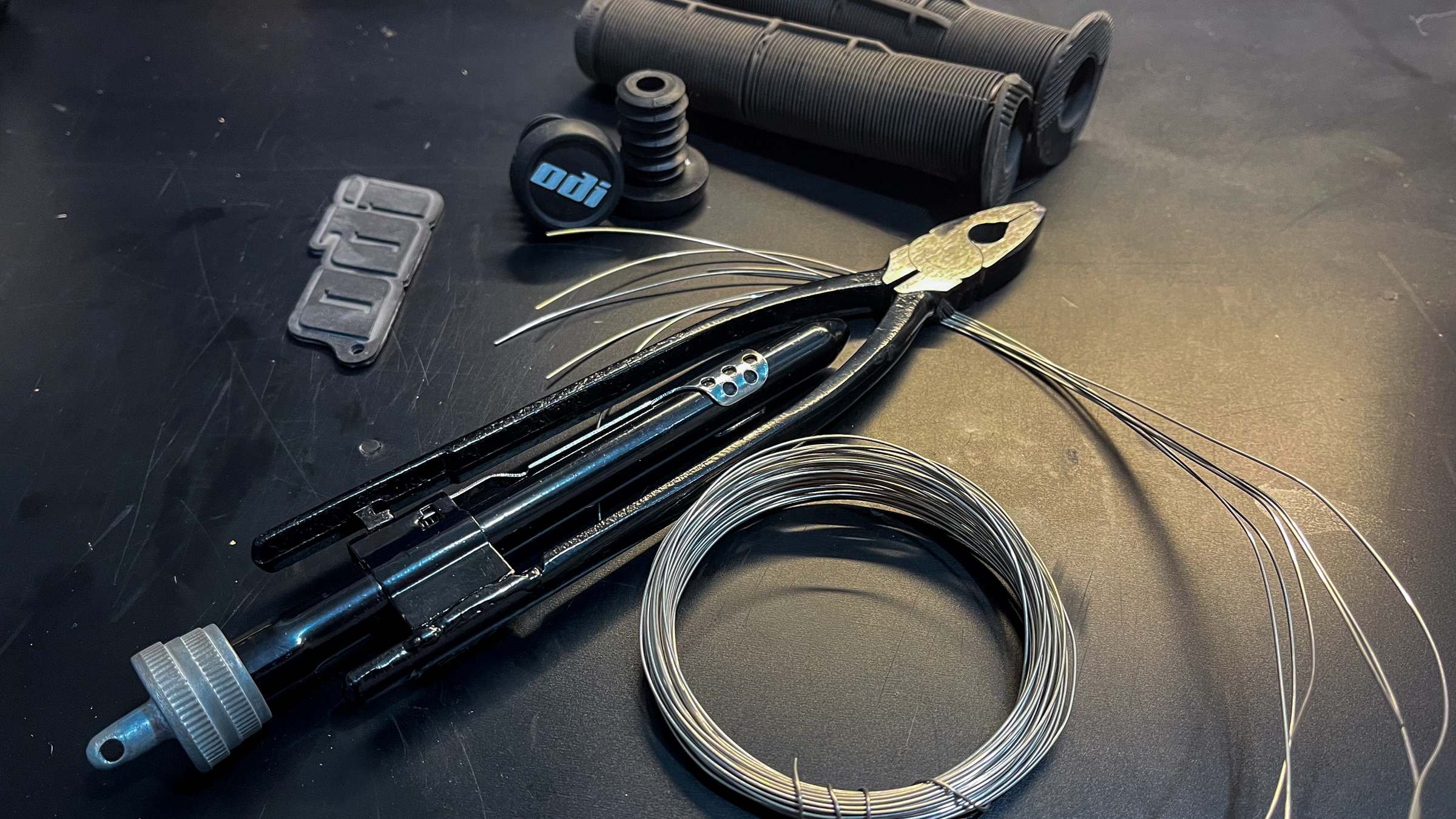 Gluing grips isn’t as much hassle as it sounds. I’ve used Renthal’s proprietary grip glue, which works great, and also had great results with Shoe Goo (good luck scraping this back off your bars, though!). Generally I’ll just use hairspray, the cheaper and nastier the better. Others swear by GT85, isopropyl alcohol, spray paint or just blasting them on dry with an air compressor. Likewise for the wire – a trip to an MX store will get you enough wire to last a lifetime, and a set of proper twisting pliers which make twisting grip wire borderline enjoyable (but regular pliers will work just fine too).